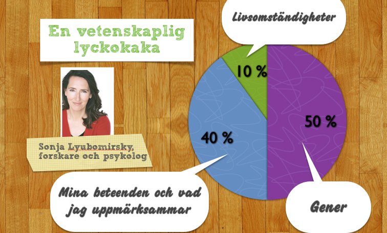 Sonja Lyubomirskys forskning visar att 50 procent av vår lyckonivå beror på våra gener, medan enbart tio procent beror på våra livsomständigheter som var vi bor, hur mycket pengar vi tjänar, vår levnadsstandard eller om vi är gifta eller inte. Resten, hela 40 procent, avgörs av våra beteenden. Det kan vara att små saker som att skriva ner några saker som man är tacksam för i livet, eller att tacka en kollega för något hen gjort för en, till att utveckla sina relationer eller stora funderingar på vad som är viktigt i livet och hur man tar steg för att närma sig det.