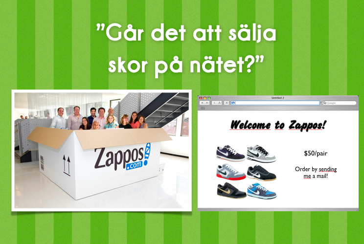 Idag är svaret ganska uppenbart men när Nick Swinmurn grundade Zappos 1999 var det inte lika tydlig huruvida detta var en bra idé eller ej. Zappos är idag en av de största nätbutikerna och 2009 såldes företaget till Amazon för 1,2 miljarder dollar. Allt började dock med ett experiment. Istället för att köpa in ett lager med skor, sätta upp en webbshop, anställa personal så la Nick upp ett gäng bilder på skor på zappos.com. Om någon ville köpa skorna fick beställa dem genom att mejla honom. De Zappos tidiga kunder inte visste var att Nick inte hade några skor på lager utan att han istället gick till skoaffären han bodde bredvid och köpte de skor som kunderna beställde. Ett ganska enkelt men effektivt experiment som talade om huruvida han var rätt eller fel ute.