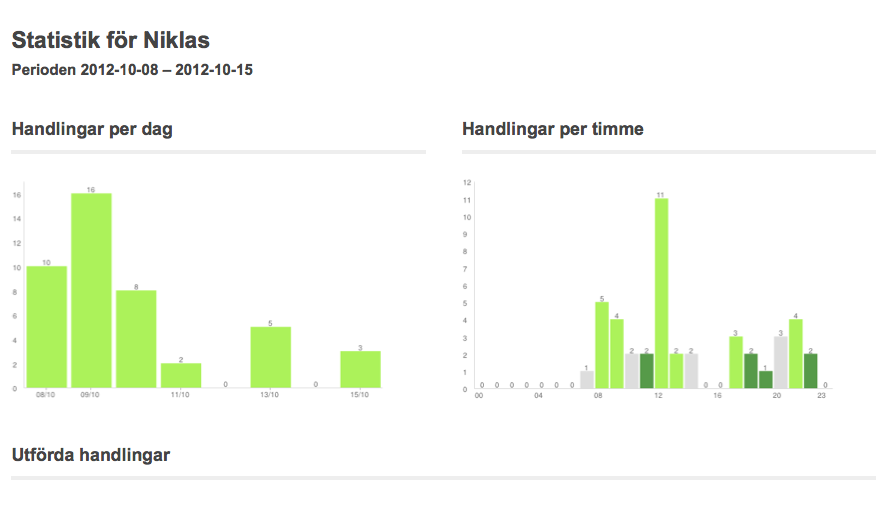 Visst kan jag känna igen mig i Alexanders beskrivning. Jag, John och Jenny pratade då och då om insatsen och eftersom Jenny kunde följa vårt arbete via Viary så skickade hon ibland små motiverande meddelanden till mig. Det är intressant att se hur dessa små men motiverande knuffarna påverkade min statistik, det vill säga fick mig att arbeta mer med mina relationer. Alexander föreslår också en annan lösning på mitt problem.