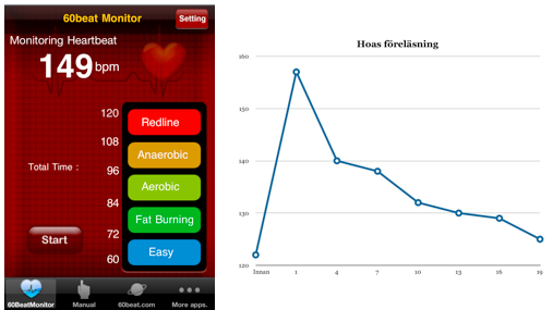 I mitt arbete med scenframträdanden använder jag pulsklocka för att mäta hur de fysiologiska påslagen förändras under talsituationer – habituering. Det fysiologiska påslaget består dels av stresshormoner som adrenalin samt kortisol, dels av en ökad syretillförsel till hjärtat och resten av kroppen. Under föreläsningen var Hoa med på mitt experiment för att testa hur hans påslag förändrades. Nedan kan du se data som vi hämtade in med ”60beat puls”, bestående av dels ett pulsband och dels en app.