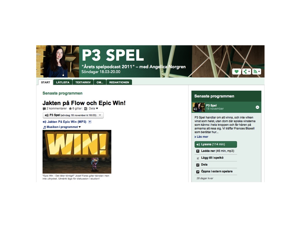 “P3 Spel på söndag handlar om att vinna, och inte vilken vinst som helst, utan dom där episka vinsterna som känns i hela kroppen och får håren på armarna att resa sig. Vi träffar Frances Blaxell som berättar hur det känns att vara först i världen med att spöa en boss i World of Warcraft och precis hur långt hon var villig att gå för att få uppleva en “epic win”.