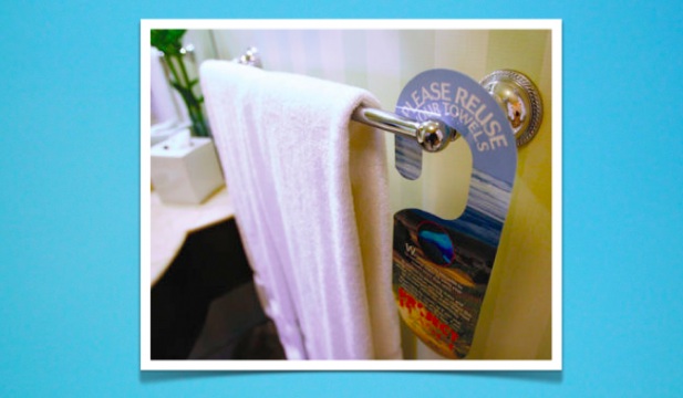 ”Använd handduken flera gånger så slipper vi tvätta vilket sparar oss pengar.”