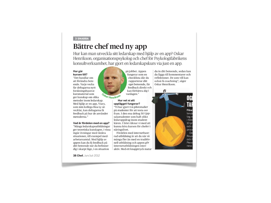 Under våren har vi genomfört ett pilotprojekt med en delvis webb- och appbaserad ledarskapskurs. Ledarverkstan har uppmärksammats av UNT, Ergo, Journalisten och nu senast även tidningen Chef.